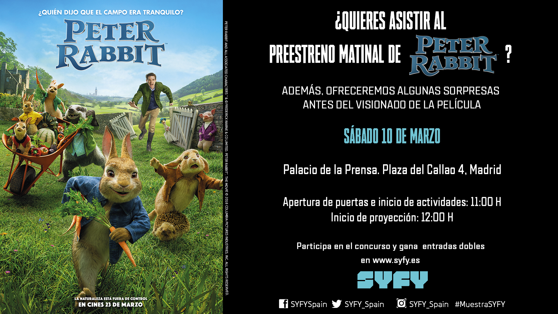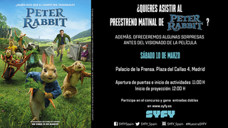 Cada ganador recibirá válida para 4 personas para la proyección matinal preestreno de ‘Peter Rabbit’ en el marco de la 15 Muestra SYFY de Cine Fantástico, el próximo sábado 10 de marzo de 2018 a las 11:00 horas. El evento tendrá lugar en el Cine de la Prensa, sito en la Plaza de Callao, número 4 de Madrid. El acceso al recinto será mediante lista de invitados por nombre y apellidos en puerta.