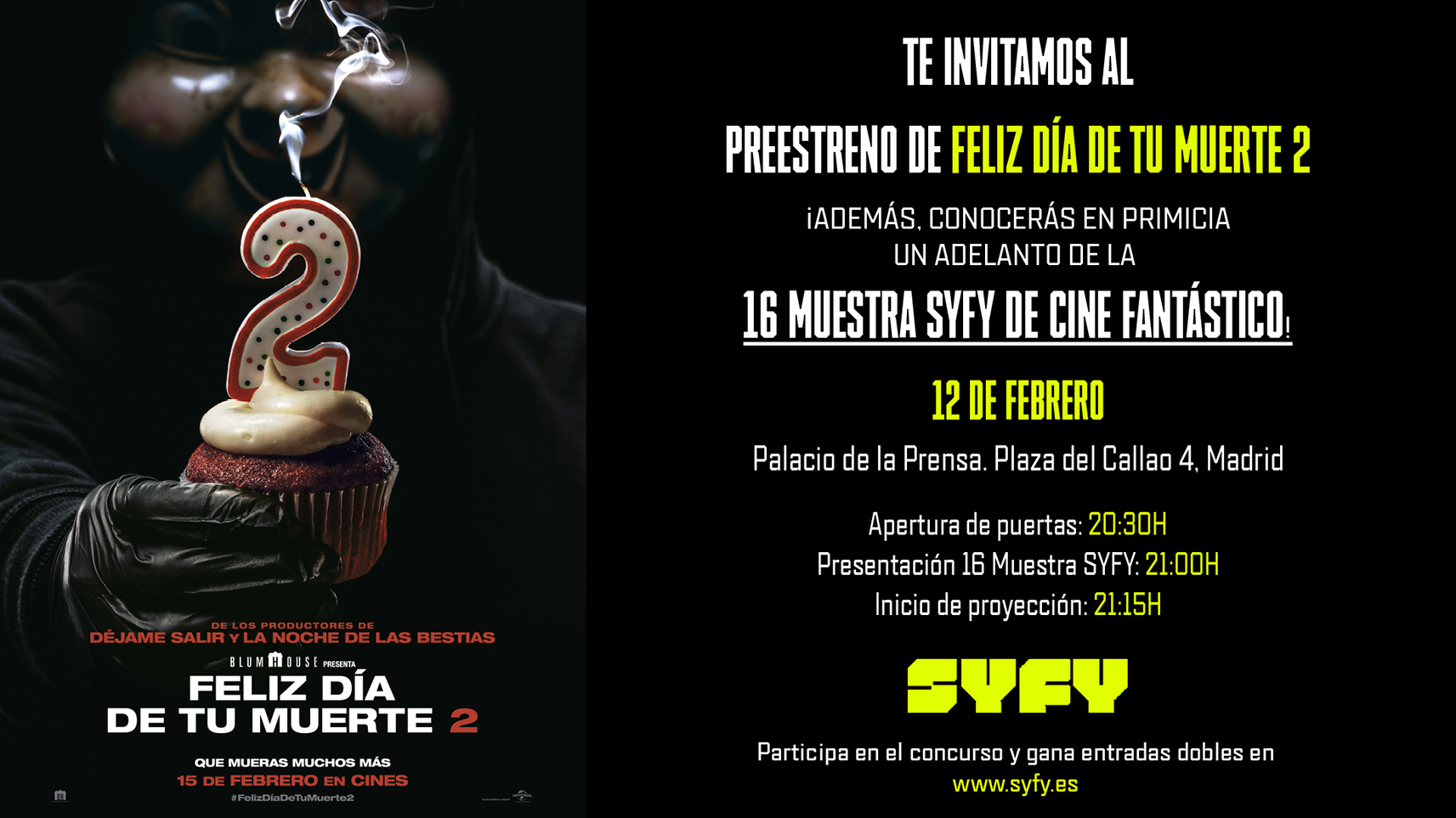 Está cerrado el envío para este formulario.El próximo 12 de febrero SYFY presenta la 16 Muestra SYFY de Cine Fantástico en el Cine Palacio de la Prensa de Madrid, que acogerá el evento entre el 7 y el 10 de marzo. Al preestreno de ‘Feliz Día de tu Muerte 2’ le precederá la presentación del cartel de la #MuestraSYFY y un avance de su programación para esta edición.