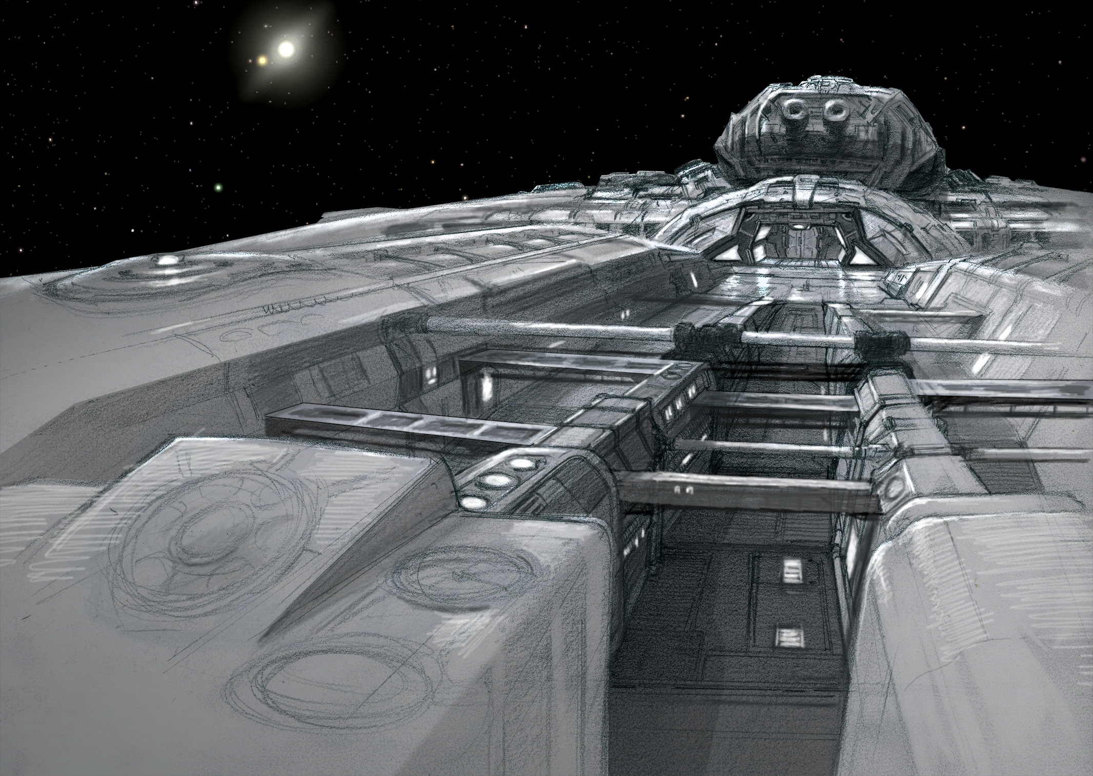 En esta galería podrás encontrar bocetos de los diseños de los escenarios de Dark Matter: la nave, estaciones espaciales, airlocks, el puesto de mando...