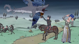 En la Edad Media ya se conocía la leyenda negra de los tiburones que caían del cielo como una plaga mortal... No había caballero que no quisiese salvar a su dama de un tiburón caído del cielo para ganar la gesta... ¡Cómo osáis, escualo del demonio!